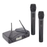 Langaton mikrofonijärjestelmä kahdella mikrofonilla laulu- ja puhekäyttöön. Sisältää kaksi AKG HT 40 Mini -käsilähetintä ja AKG SR 40 Mini 2 -kaksikanavaisen vastaanottimen.