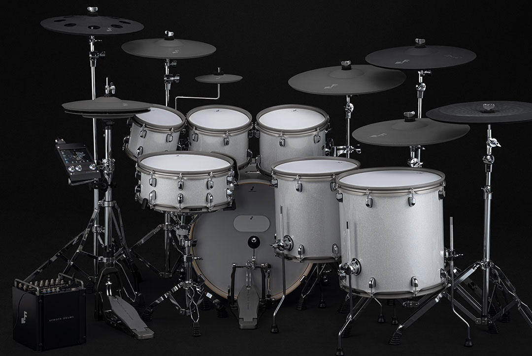- 6-kerroksiset koivurunkoiset rummut verkkokalvoilla: 20″ x 15″ bassorumpu, 14″ x 5.5″ kolmialueinen virveli “Side-Rim” -lisäosalla, 8″ x 6.5″, 10″ x 7″ ja 11″ x 8″ kaksialueiset etutomit, sekä 13″ x 13″ ja 15″ x 15″ kaksialueiset lattiatomit