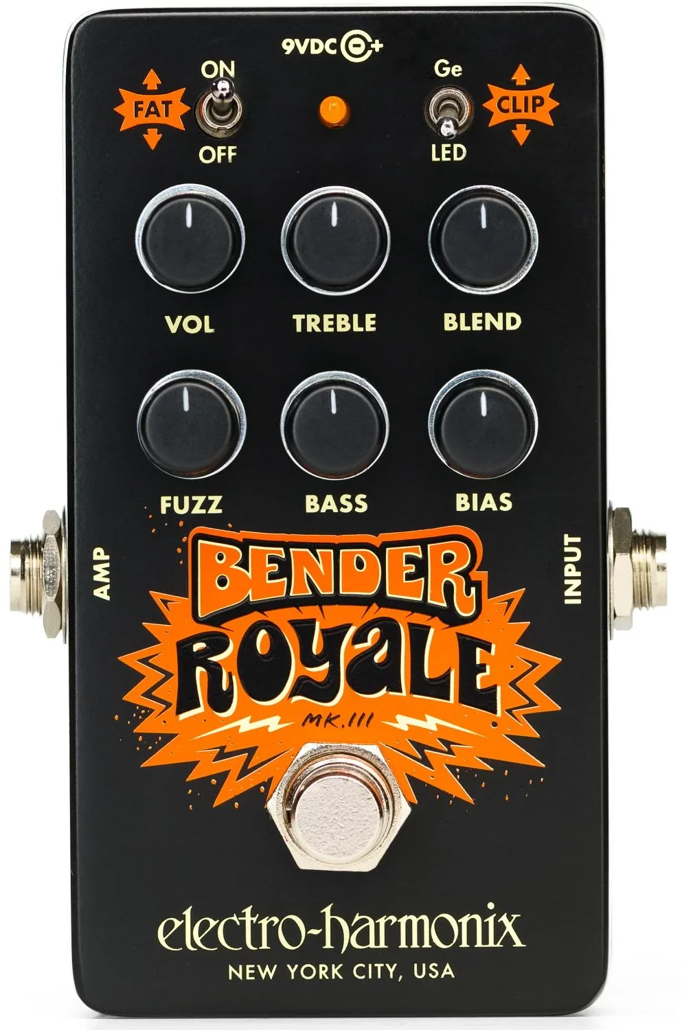 EHX Bender Royale Fuzz pohjautuu vintage-tyyliseen germanium MkIII-piiriin tarjoten tuhdin, täyteläisen ja monipuolisen fuzz-soundin. Alkuperäinen kolmen säätimen kokonaisuus löytyy Vol-, Fuzz-ja bass -napeista. Modernien päivitysten ytimessä on massiivinen Fat-kytkin, joka lisää reilusti bassoa ja alakeskitaajuuksia soundiisi. Clip-kytkin vaihtaa viimeisen germanium-transistorivaiheen klippirakennetta. Se muuttaa transistorin bias-diodin germaniumista LEDiin, mikä tuo soundiin karheamman, rajumman sävyn ja korostaa varhaisten fuzzien rosoista fiilistä.
