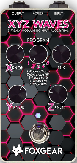 Pedaaliin on valittu viisi Foxgearin parasta modulointialgoritmia, jotka on suunniteltu erityisesti kitaristeille ja basisteille. XYZ WAVES sisältää kolme monitoimisäädintä, jotka valitusta ohjelmasta riippuen tarjoavat poikkeuksellisen hallinnan ja monipuolisuuden erittäin kompaktissa koossa.