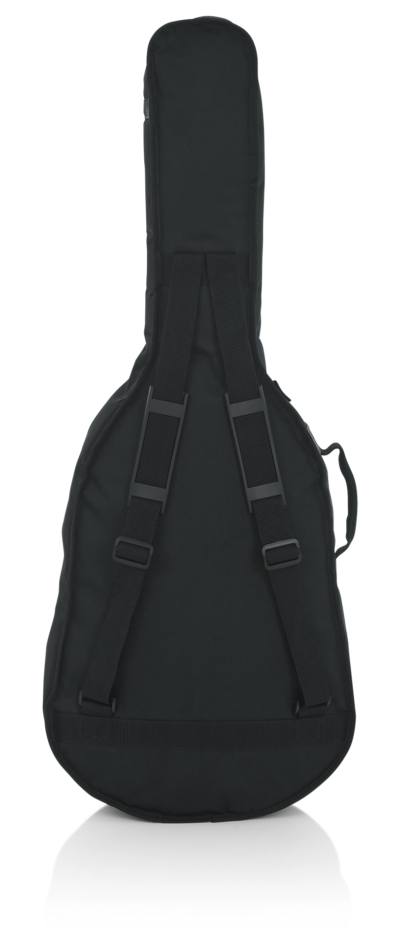 Kevyesti topattu, vahvasta nylonkankaasta valmistettu pienikokoisen akustisen kitaran pussi. Sivutasku ja reppuremmit. Pituus n. 97cm.