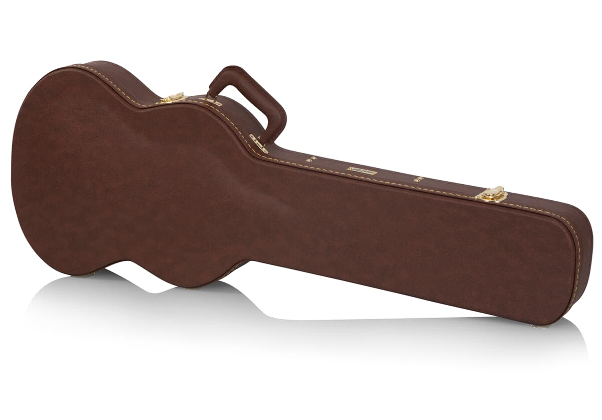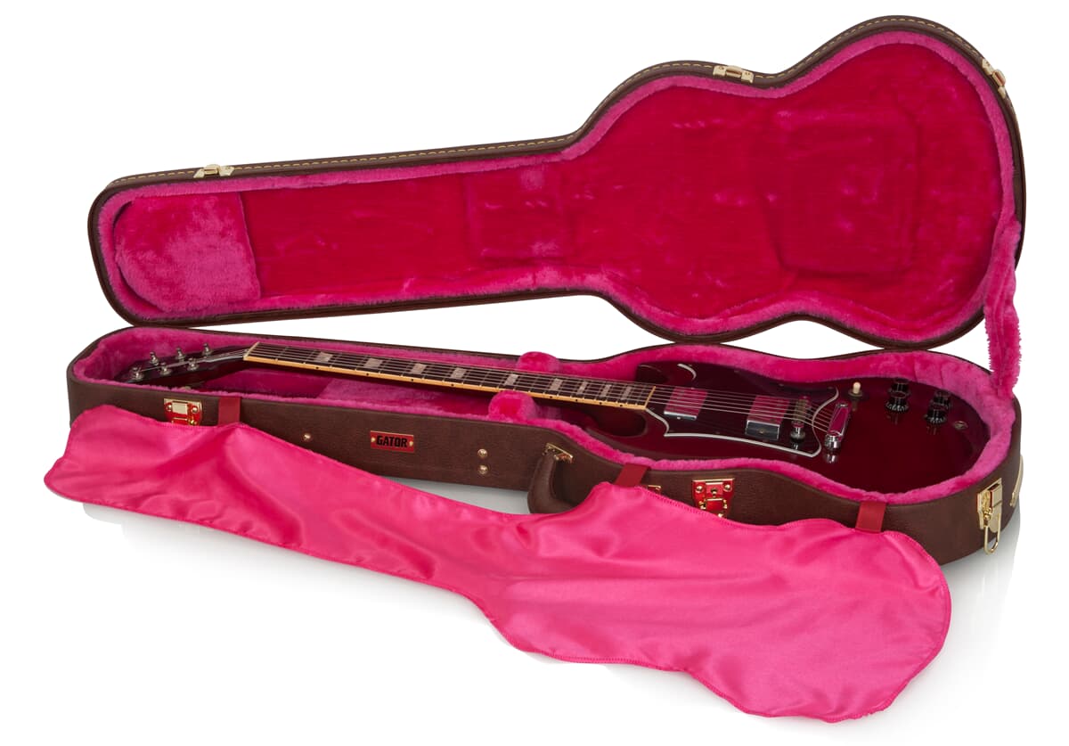 Laadukas vanerikotelo SG-tyylisille kitaroille. Väri: ruskea/pinkki