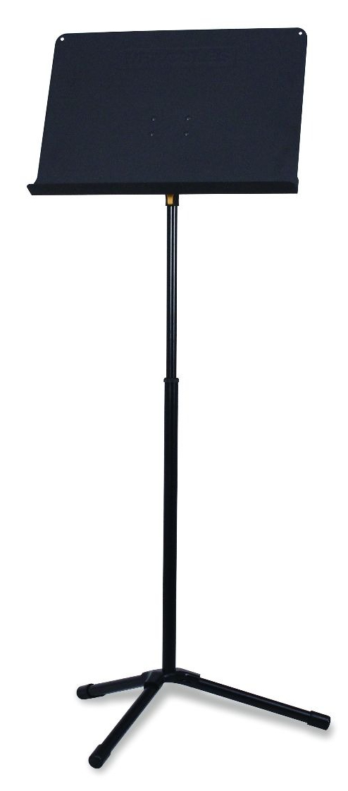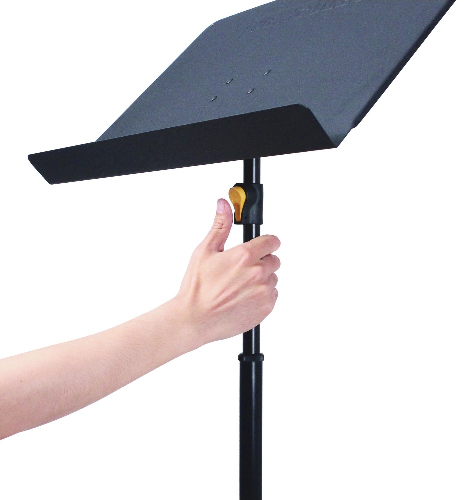 Orkesterinuottiteline EZ Grip-korkeudensäätömekanismilla. Telineen rakenne mahdollistaa useamman telineen pinoamisen ja helpon varastoinnin.