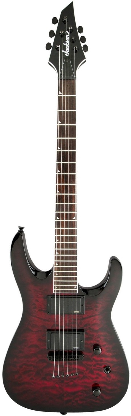 Käytetty, erittäin siisti Jackson SLATTXM Q 3-6 -sähkökitara läpi-rungon kaulalla ja EMG:n aktiivimikrofoneilla, Transparent Red Burst