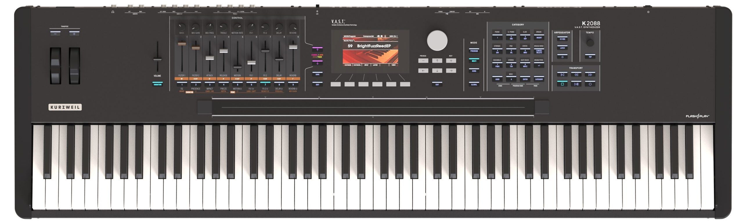 K2088 yhdistää useita synteesitekniikoita (VAST, FM, virtuaalianaloginen ja urkumallinnus) sekä laajan samplekirjaston ja tehokkaan efektiprosessoinnin, tarjoten erittäin laajat mahdollisuudet sekä soundien rakentamiseen että live-esiintymiseen. Musacorner