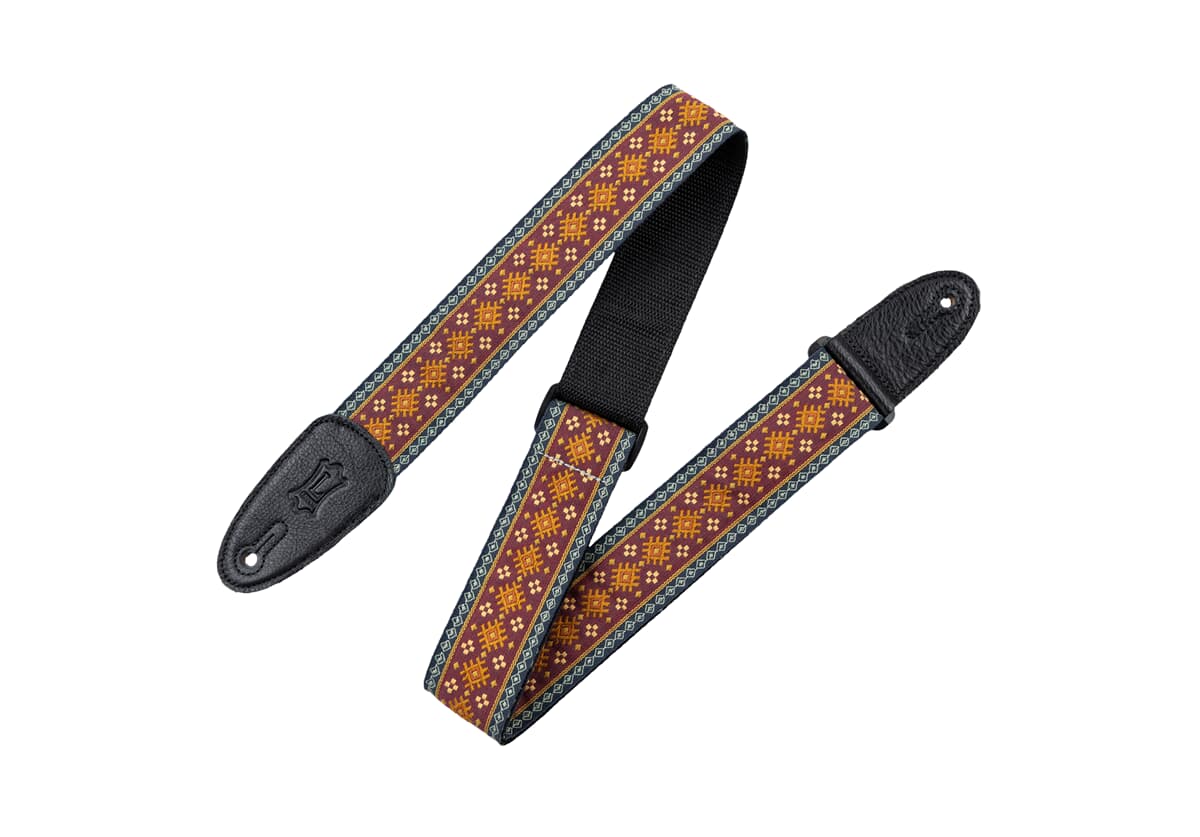 Kudottu kitarahihna nahkapäillä. Aidot nahkapäät. Leveys 5cm ja maksimipituus n. 152cm. Väri: Red Jacquard. Made in Canada!