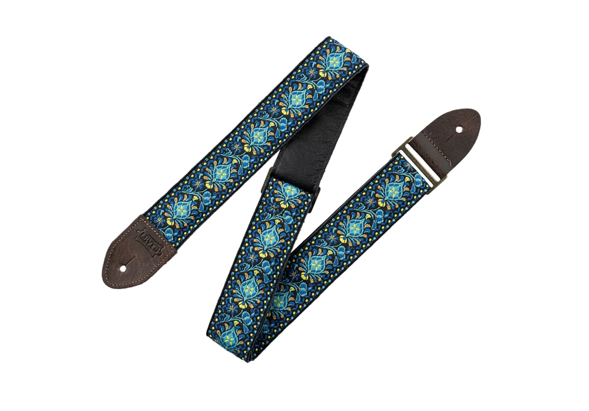 Puuvillainen kitarahihna. Aidot nahkapäät. Leveys 5cm ja maksimipituus 152cm. Väri: Vintage Blue Jacquard. Made in Canada!