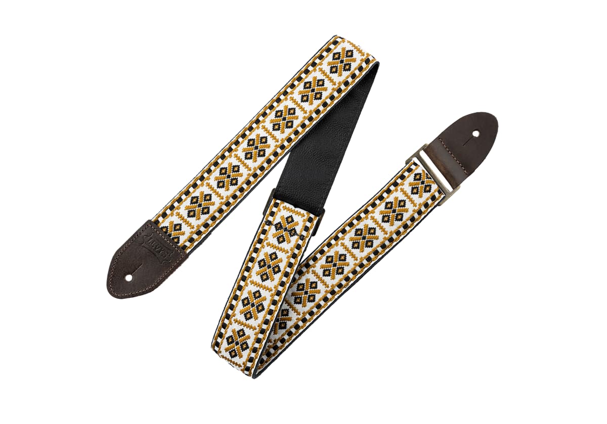 Puuvillainen kitarahihna. Aidot nahkapäät. Leveys 5cm ja maksimipituus 152cm. Väri: Vintage Brown & White. Made in Canada!