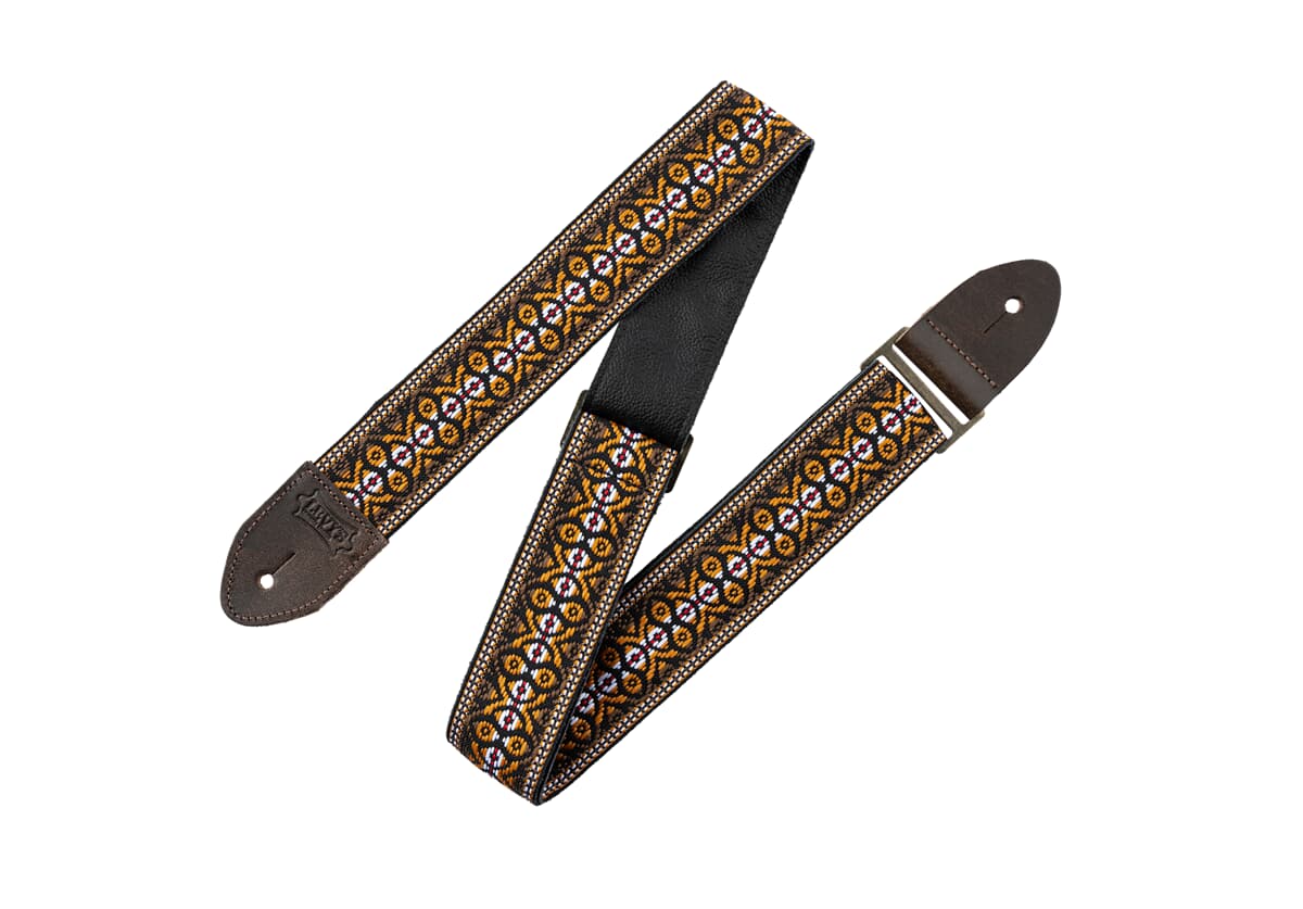 Puuvillainen kitarahihna. Aidot nahkapäät. Leveys 5cm ja maksimipituus 152cm. Väri: Vintage Orange & Brown. Made in Canada!