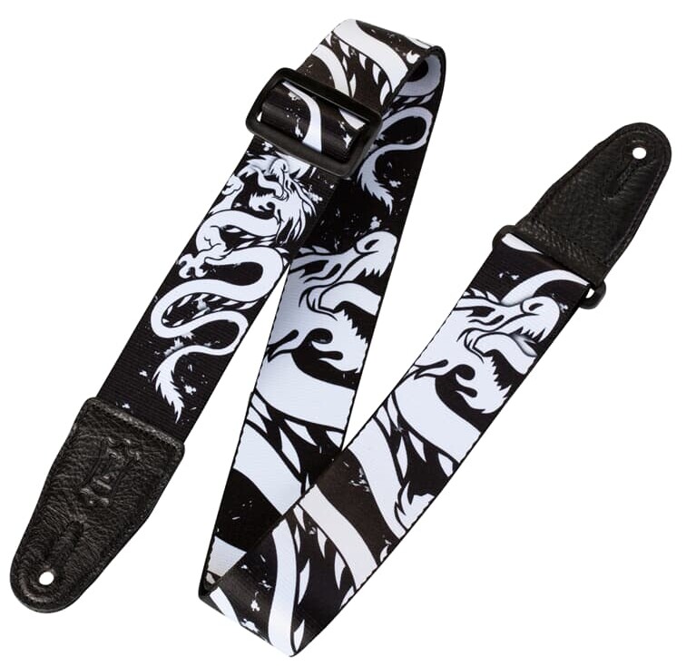 Kitarahihna, polyesteria. Aidot nahkapäät. Leveys 5cm ja maksimipituus 165 cm. Väri: Black & White Dragon