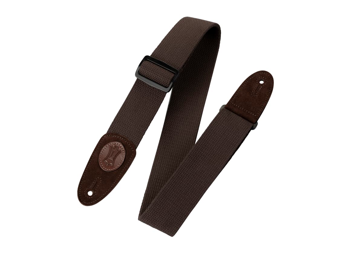 Puuvillainen kitarahihna. Aidot nahkapäät. Leveys 5cm ja pituus 86-150cm. Väri ruskea. Made in Canada!