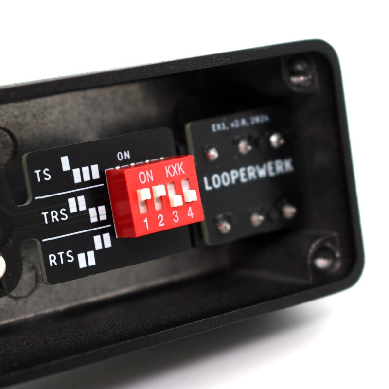 Mini Expression Pedal toimitetaan oletuksena TRS-konfiguraatiossa, jota useimmat efektipedaalit käyttävät. Se liitetään efektiin stereokaapelilla (TRS). Jos haluat käyttää pedaalia Line 6- tai Eventide-efektien kanssa (joissa käytetään monokaapelia (TS) tai RTS-konfiguraatiossa, sisällä on kytkin, jolla konfiguraation voi helposti vaihtaa.