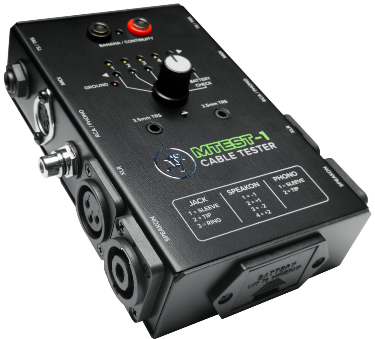 Mackie MTEST-1 -kaapelikoetin toimii yhdellä 9V paristolla ja hallitsee kaikki tavallisimmat liittimet kuten 6,3mm TRS, 6,3mm TS, XLR, RCA, Speakon, 3,5mm TRS, MIDI ja banaaniliittimet.