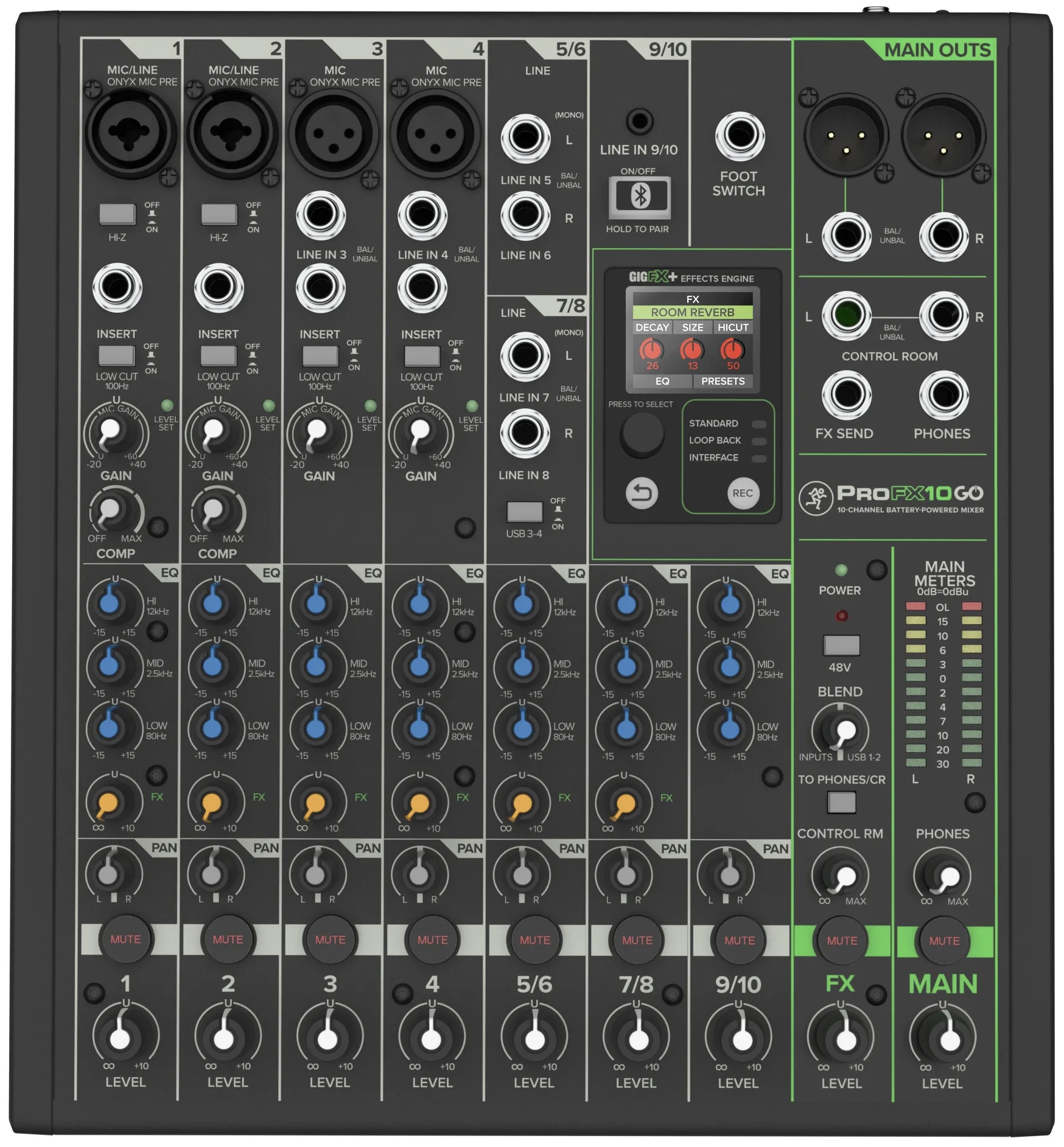 Mackie ProFX10 GO on kannettava, akkukäyttöinen, 10-kanavainen analoginen mikseri, joka yhdistää ammattimaisen äänenlaadun ja USB‑C ‑tallennusominaisuudet käytettäväksi jopa ilman verkkovirtaa. Mukana tulevan, vaihdettavan GB‑10 ‑akun ansiosta laite toimii jopa 8 tuntia yhdellä latauksella. Se on täydellinen valinta liikkuville muusikoille, podcastaajille ja tapahtumiin. Musacorner