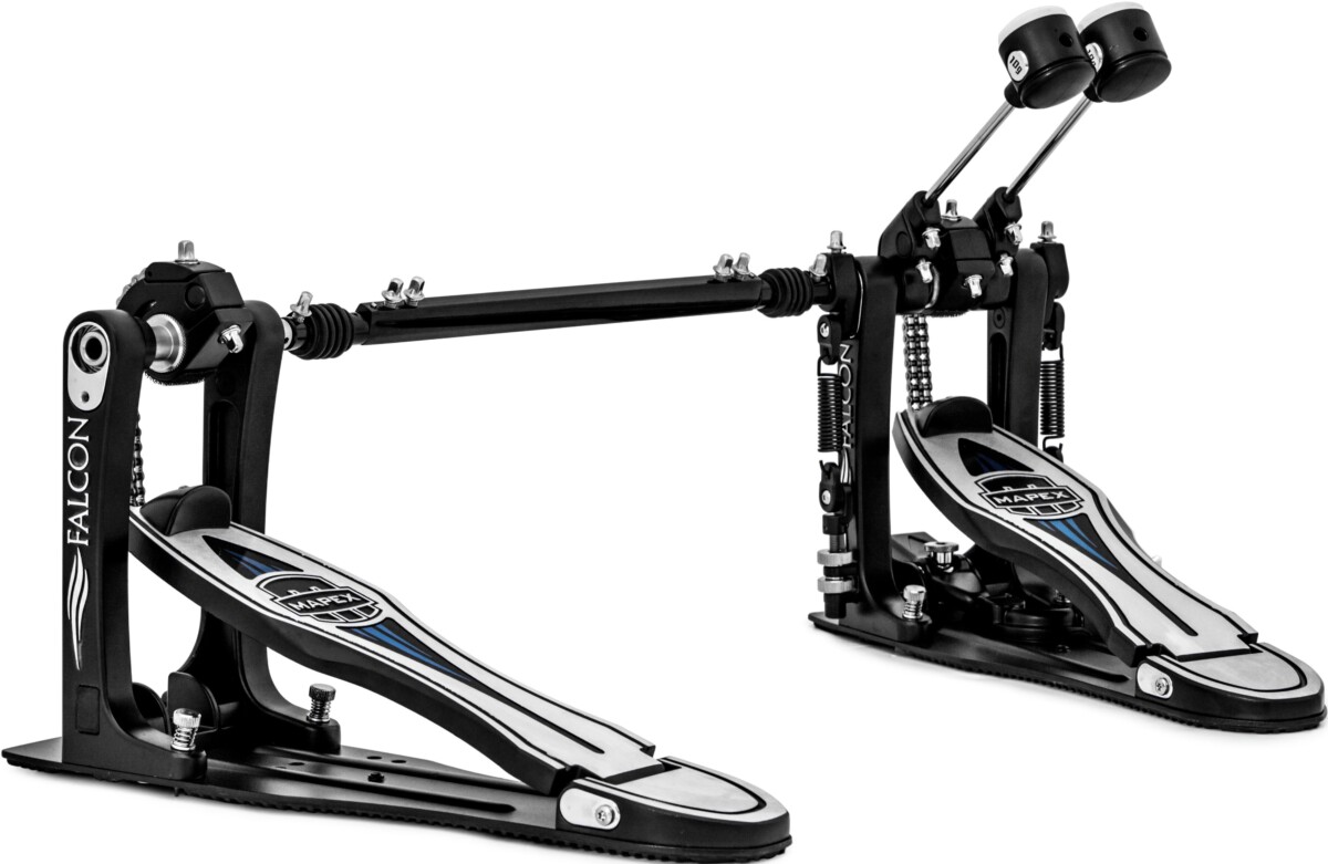 Mapex Falcon-tuplapedaali. Kenties pehmeätoimisin tuplapedaali, jolla koskaan olet soittanut. Vaihdettavat vetomekanismit erilaisiin tilanteisiin ja tyyleihin. 2-puoleiset nuijat vaihdettavilla painoilla. Mukana kuljetuslaukku.