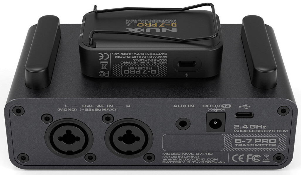 NUX B-7 PRO on digitaalinen, täysin langaton in-ear -monitorijärjestelmä, jossa on automaattinen käyttöönotto, häiriötön 2,4 GHz:n lähetystaajuus ja 24-bittinen/48 kHz korkealaatuinen stereoääni. Sen toimintasäde on jopa 50 metriä, ja langaton siirto tapahtuu erittäin alhaisella viiveellä. Järjestelmän vastaanotin on ladattavissa langattomasti asettamalla se lähettimen päälle. Myös lähettimessä on sisäänrakennettu akku, ja koko järjestelmän akunkesto on jopa 6 tuntia yhdellä latauksella!