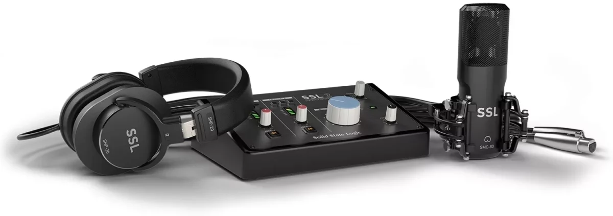 SSL 2 -äänikortti, SSL SMC 80 -kondensaattorimikrofoni + 2,5m kaapeli, SSL SHP 20 -kuulokkeet ja SSL Production Pack -ohjelmistopaketti (Win/Mac).