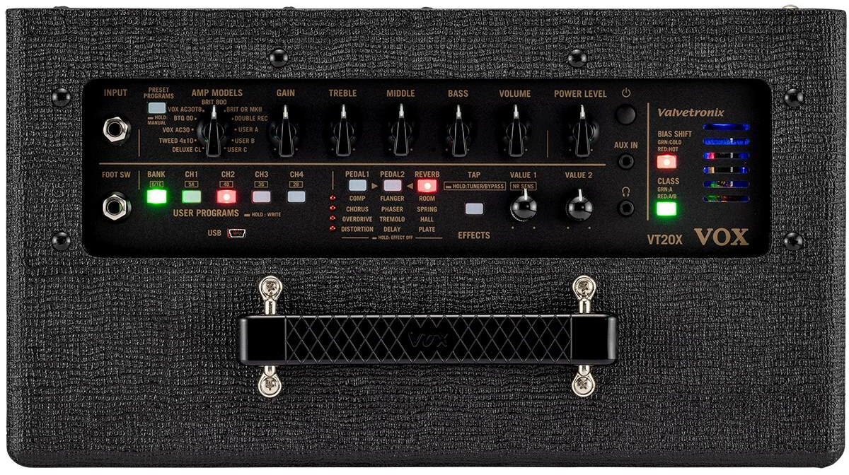 VT20X pitää sisällään 11 vahvistinmallia (20 editorin kautta), 12 efektiä, 33 käyttäjän muistipaikkaa sekä USB-liitännän, mikä tekee siitä monipuolisen työkalun kotiharjoitteluun, treeneihin ja äänityksiin. Suljettu kaiutinkaappi bassorefleksirakenteella takaa täyteläisen bassotoiston ja VOX Tone Room -ohjelmiston avulla hiot soundisi sävyt viimeistäkin ykistyiskohtaa myöten.